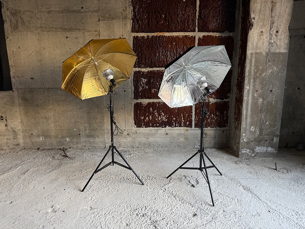 直径83cmの金と銀のソフト傘。白の傘と差し替えて利用できます。より光を集め、背景を明るくします。