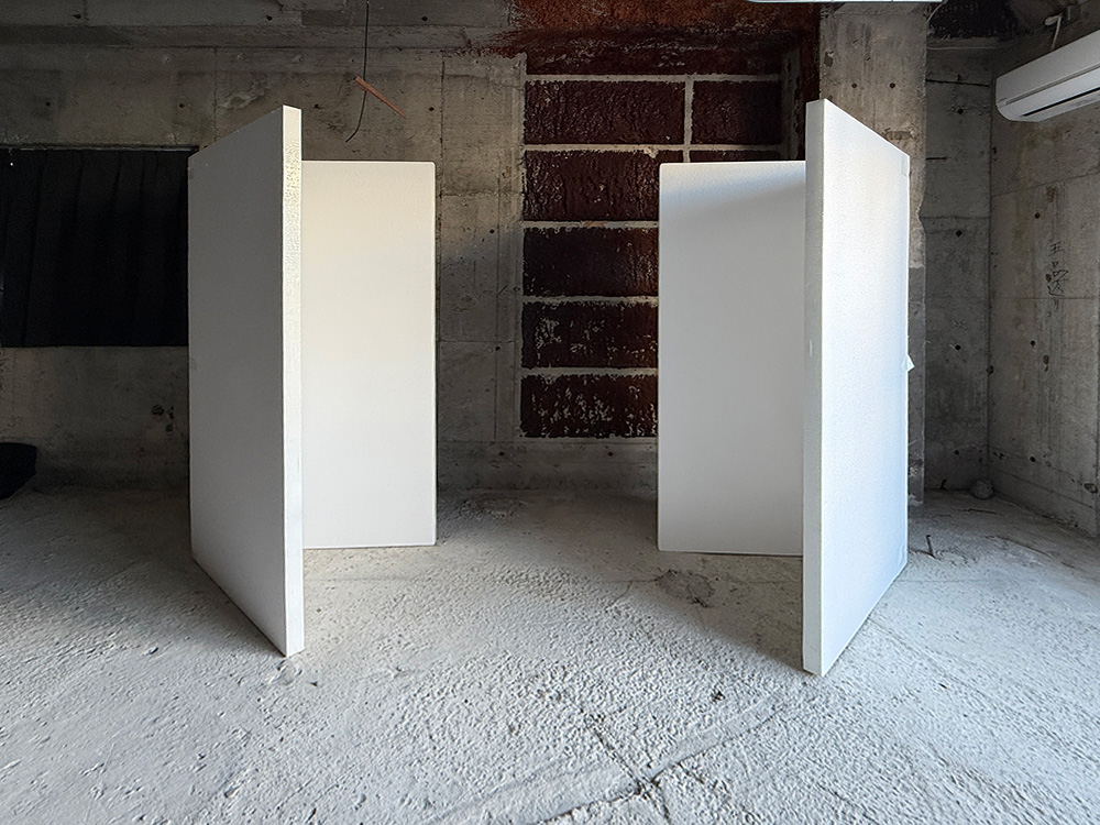 発泡スチロール製で高さ180cm、開けば幅180cm程度。光を反射させ柔らかい光を作り出したり、影を消したり、遮光する際に使います。