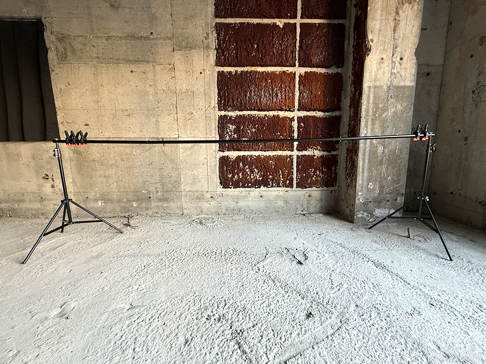 幅3m、高さ2mまで伸びる、背景スタンドが2本あります。組み立ててありますので、各種背景布を留めて利用ください。