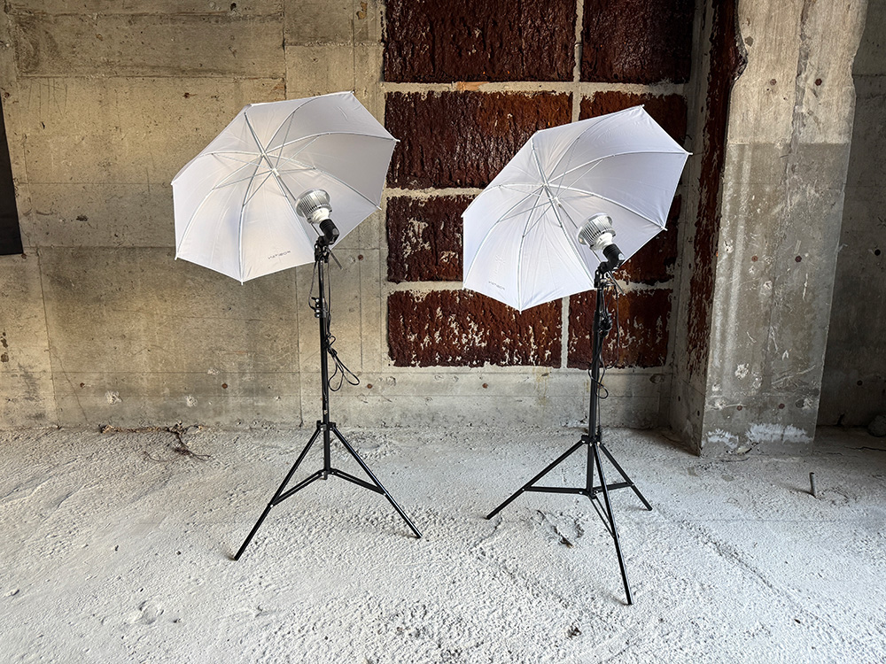 直径83cmの金と銀のソフト傘。白の傘と差し替えて利用できます。より光を集め、背景を明るくします。
