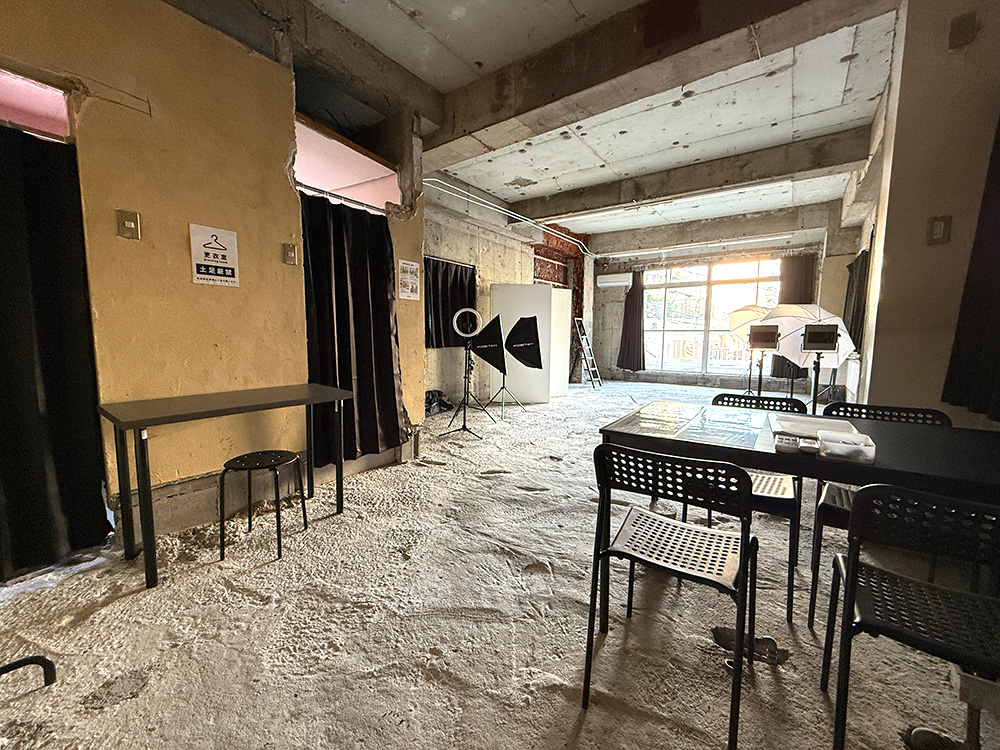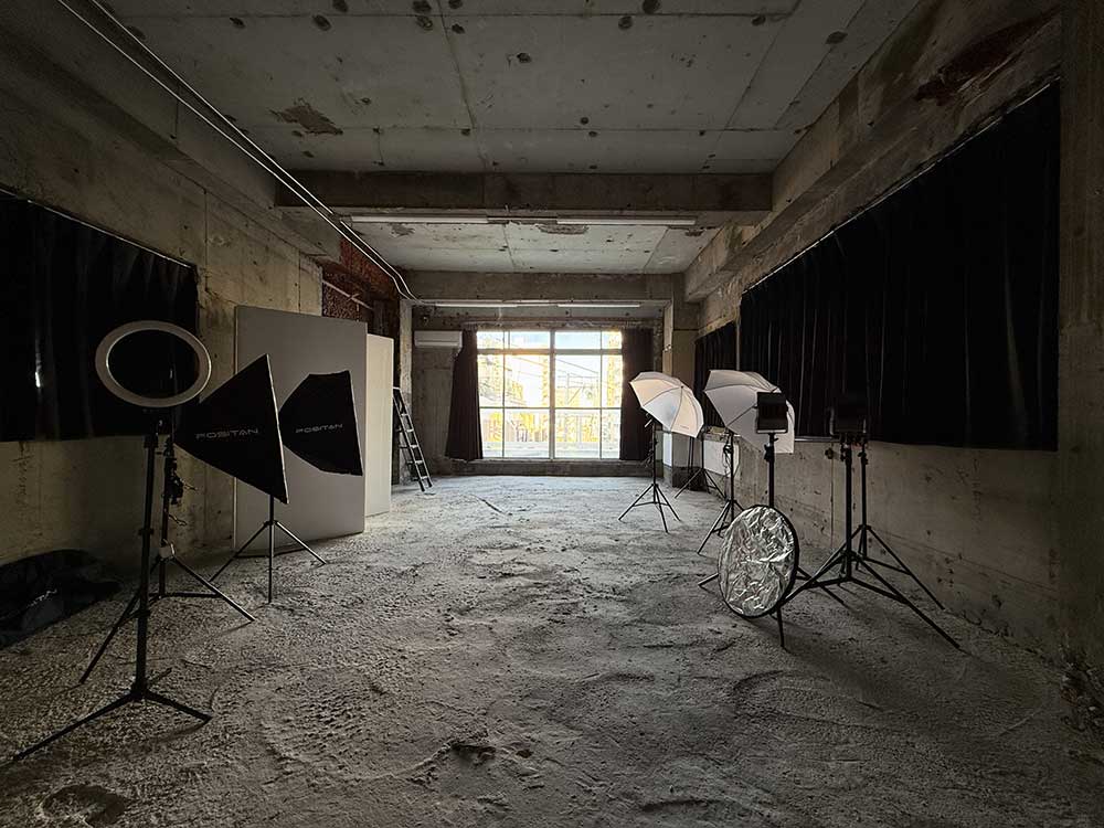 最大10人程度まで撮影できる広さのスタジオです。部屋のほとんどがスケルトン、地面もコンクリートな廃墟空間です。天井も高く、開放感があります。