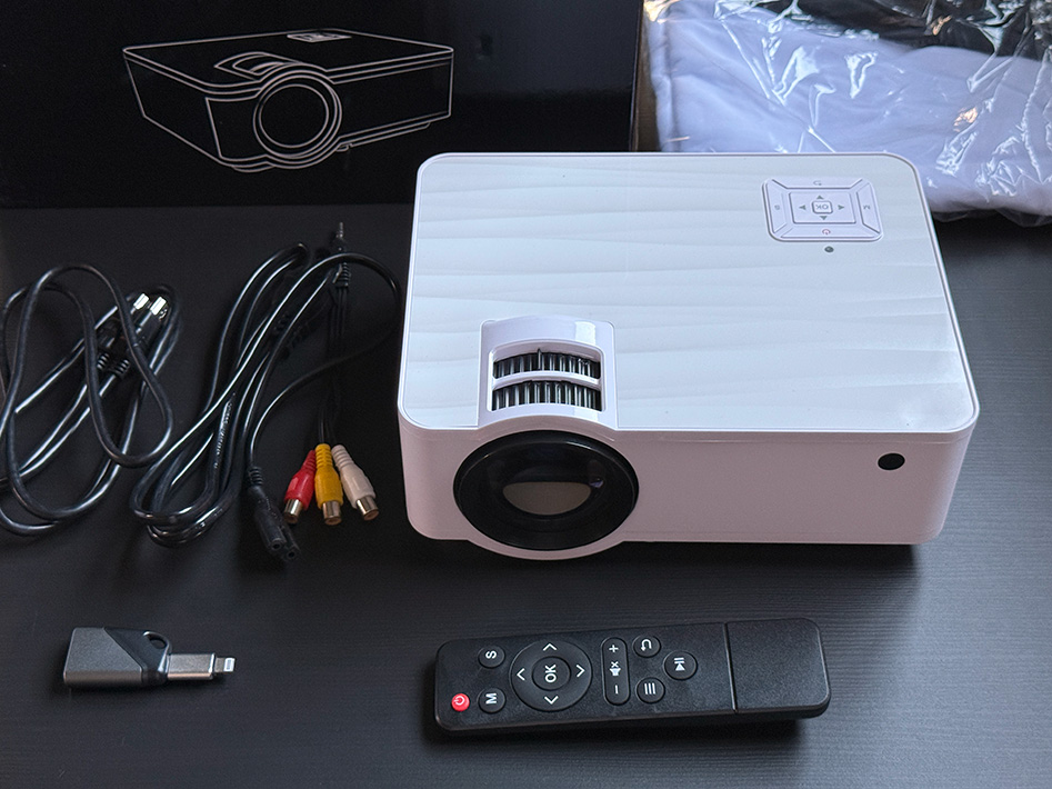 付属品は、HDMIケーブル、AVケーブル、HDMI⇔Type-Cまたはライトニングへの変換ケーブル、100インチスクリーン(布製)が同封されています。PCはもちろん、スマホに繋げて利用できます。