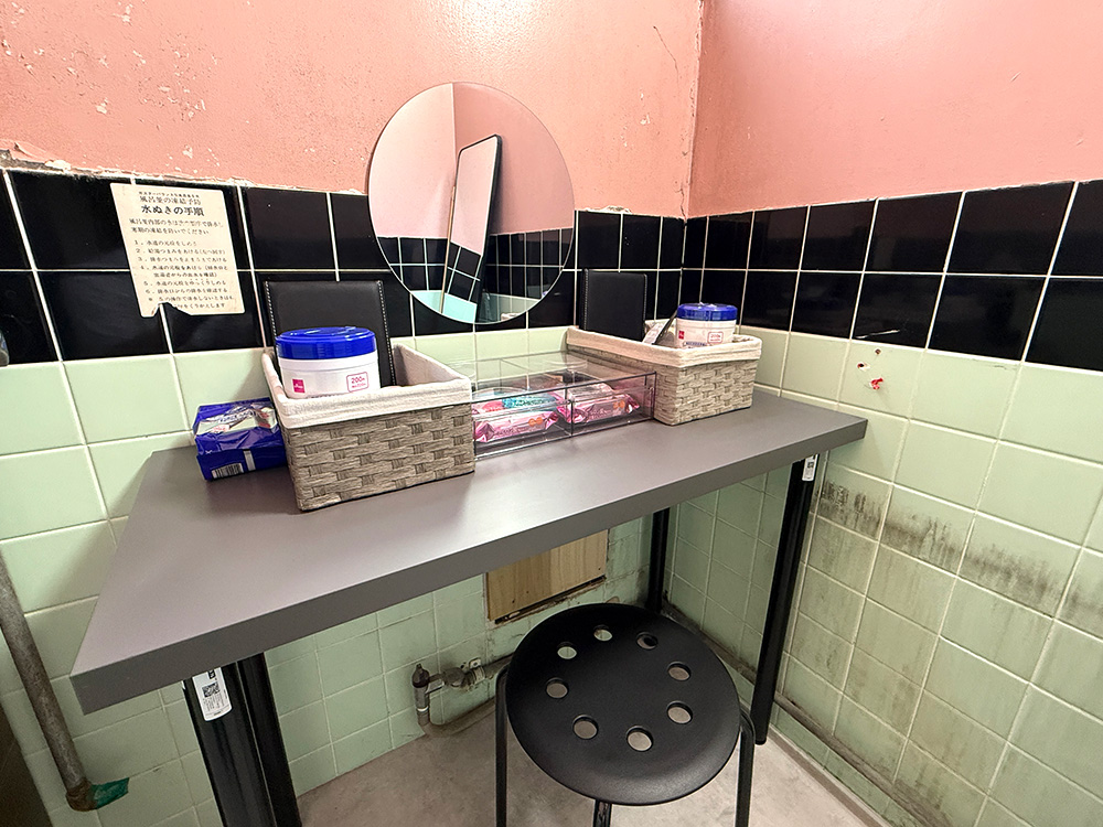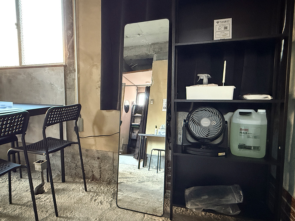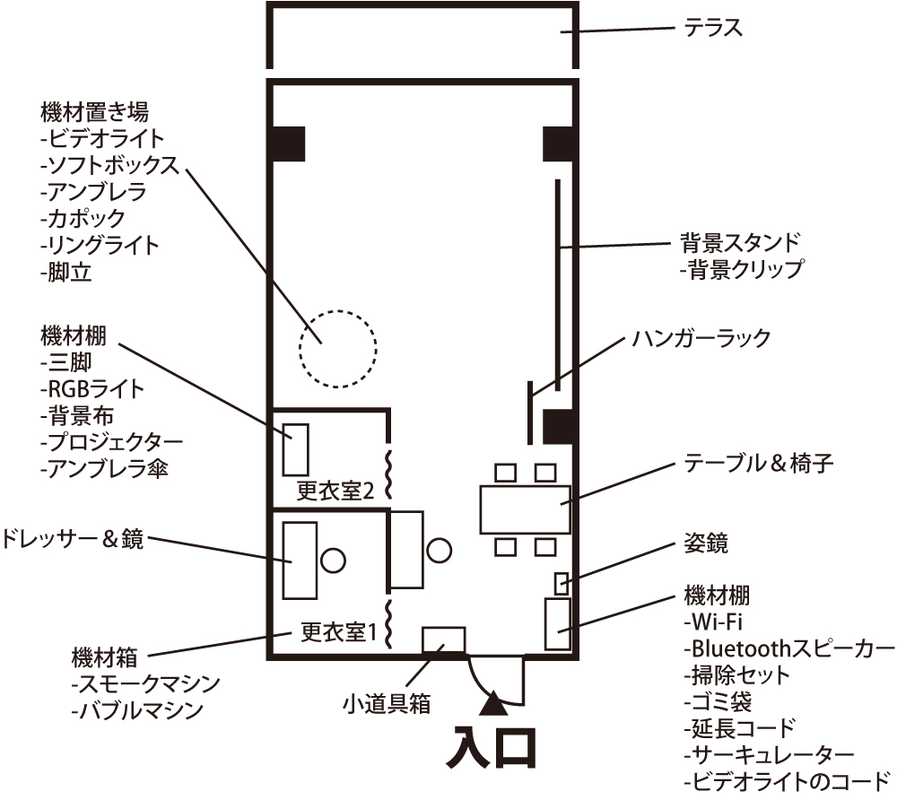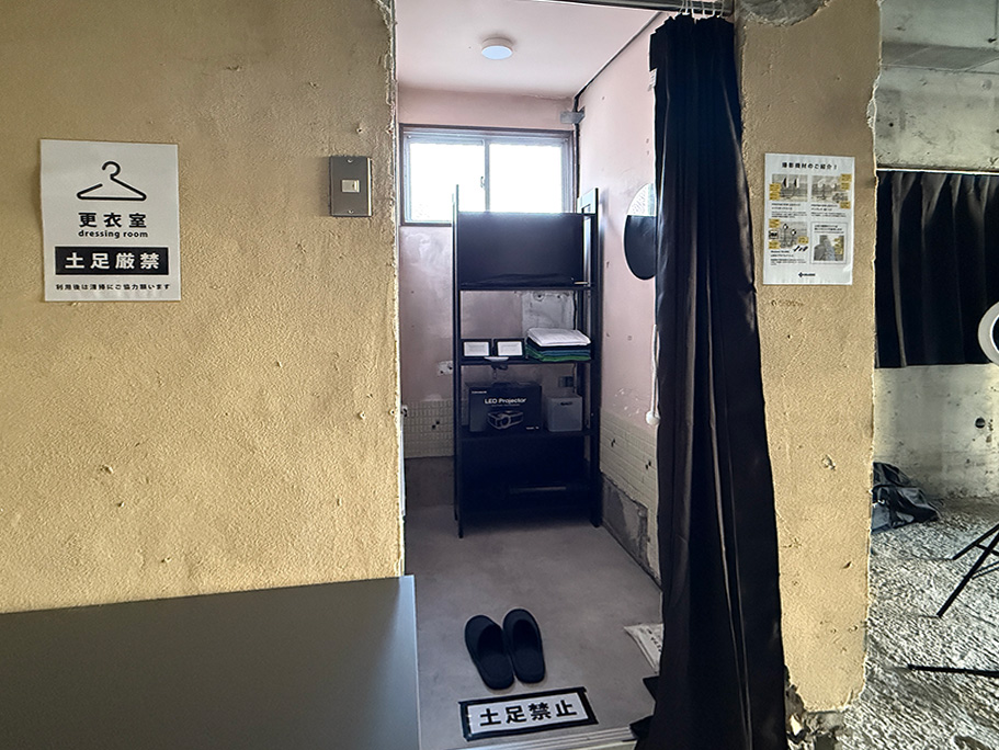 左手にある小部屋は更衣室となっております。奥の部屋は狭く、試着室くらいの広さです。壁鏡もあり、奥の棚には撮影機材が保管されています。土足厳禁。