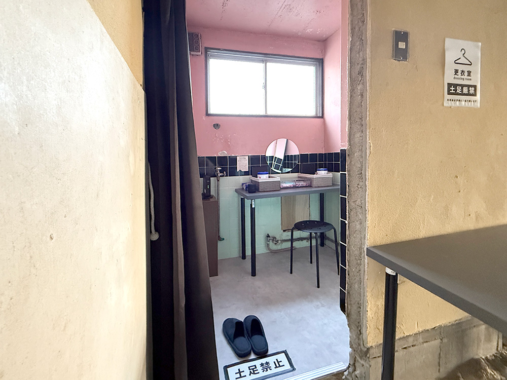 左手にある小部屋は更衣室となっております。手前の部屋は少し広く、着替えはもちろん、メイク等にもご利用ください。姿鏡もあります。土足厳禁。