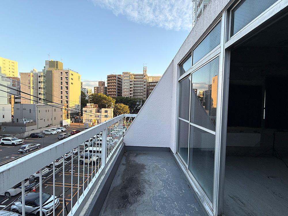 奥の大きな窓からテラスに出ることができます。仙台市青葉区大町の町並みから広がる仙台市を一望できます。テラスは東側にあり、朝日が差し込みます。