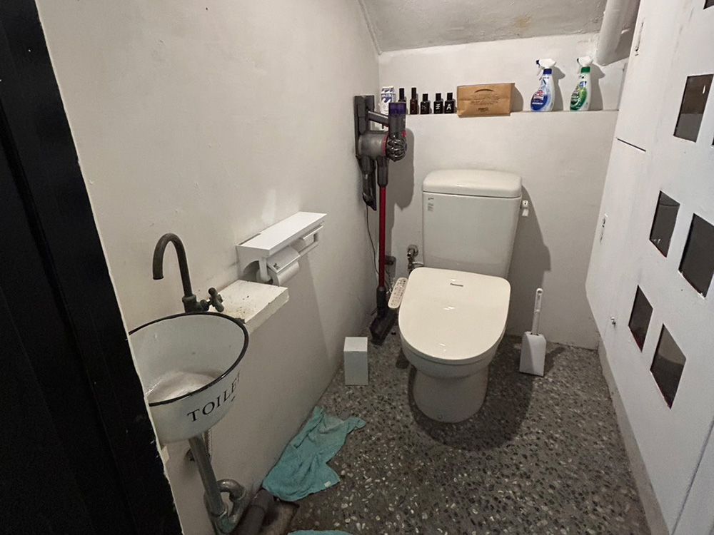 1階に共用トイレがあります。水道も使用できますが、簡易的な手洗い場が設置されている程度の小さなトイレスペースです。
